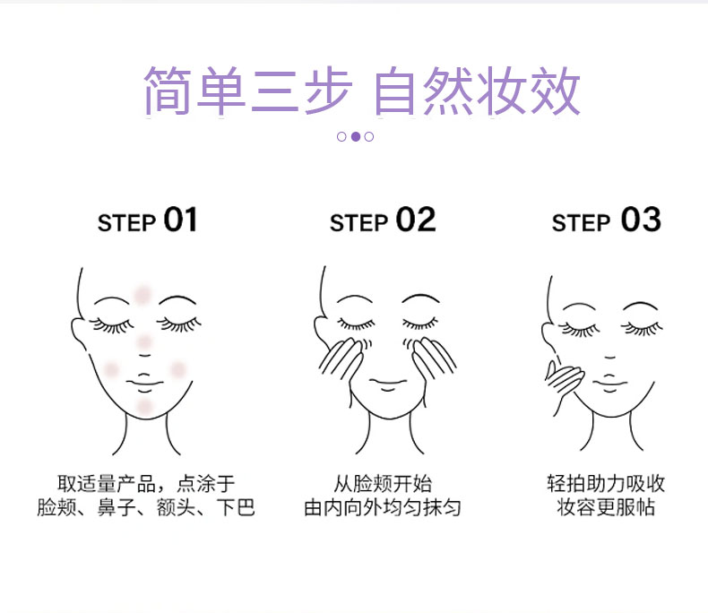 修饰黄皮、泛红肌肤,水润,轻薄服帖,拒绝多次涂抹出现的结块现象,展现自然,光彩照人的肌肤。